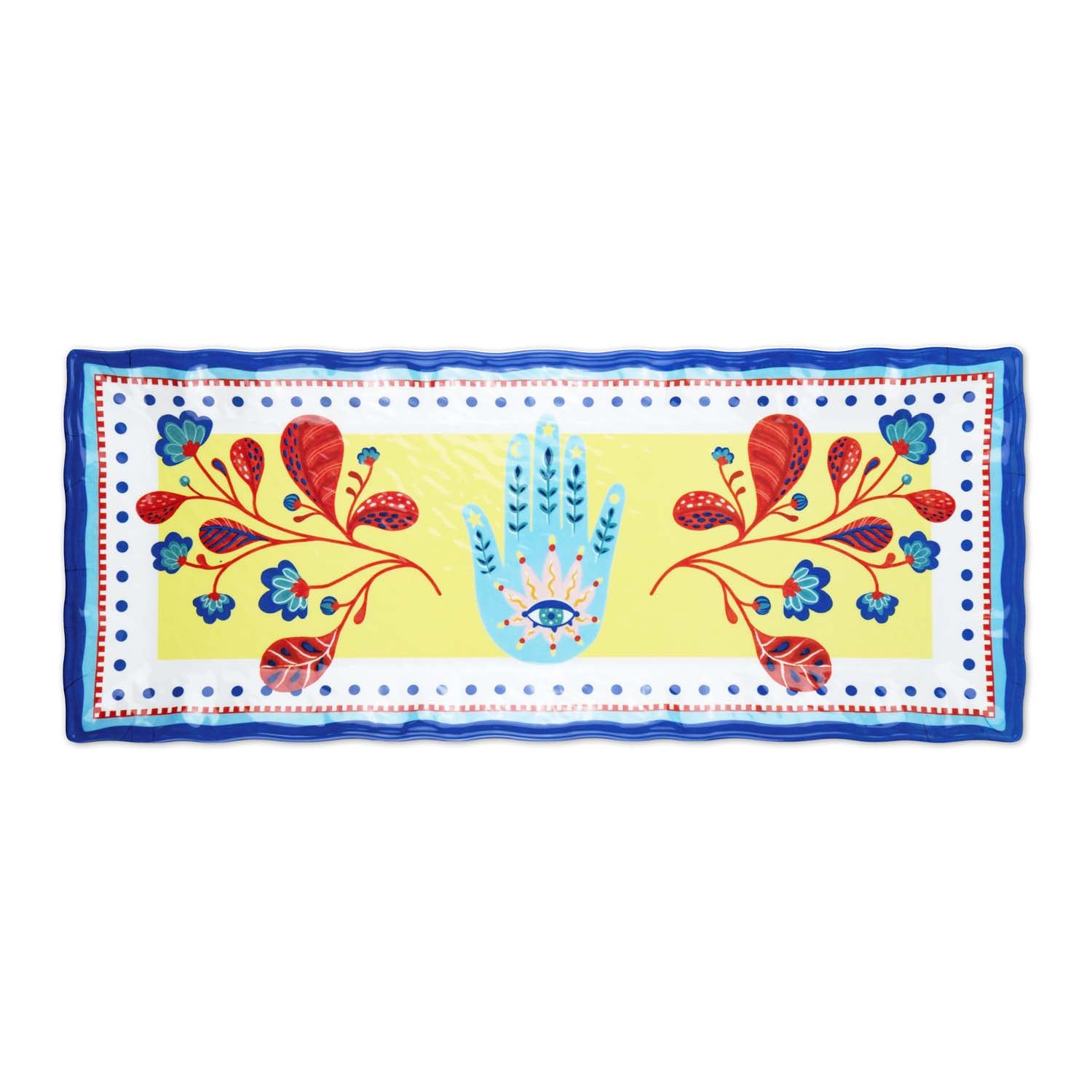 Baci Milano Mamma Mia El Desenli Dikdörtgen Tepsi, 49 cm x 20 cm x 2,5 cm boyutlarıyla geniş bir kullanım alanı sunar. Melamin malzemeden üretilmiş olan bu tepsi, Mamma Mia koleksiyonunun özgün el desenleriyle süslenmiştir. El motiflerinin detaylı ve estetik bir şekilde işlenmiş olması, tepsiye görsel çekicilik katmaktadır. Melamin malzemesi sayesinde bu dikdörtgen tepsi hafif ve dayanıklıdır, günlük kullanımda pratik bir tercih sunar. Kolay temizlenebilir özelliğiyle de kullanımı son derece rahattır. Mamma Mia koleksiyonunun zarif ve özgün tasarımıyla bu tepsi, sofralarınıza şıklık ve estetik katmak için ideal bir seçenektir.