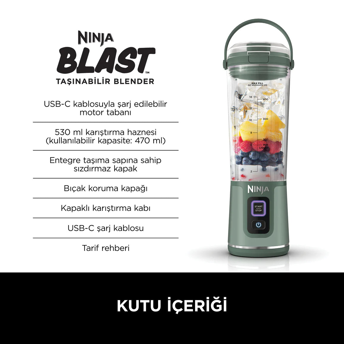 Ninja Blast Taşınabilir Blender; kablosuz, elde taşınabilir tasarımıyla siz hareket halindeyken içeceğinizi hazırlar. Yüksek hızlı Ninja karıştırma gücüyle en taze smoothie, dondurulmuş meyve ve protein shakelerini hazırlayabilirsiniz. Sızdırmaz tasarımıyla sporda, evde, arabada, iş yerinizde, parkta her alanda kullanmak için idealdir.