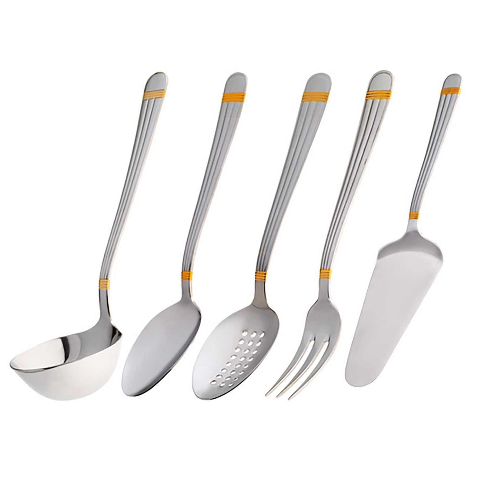 Sevilen tasarımıyla sizlerle buluşan Jumbo 4200 altın servis seti, şık tasarımıyla sizlere sunuluyor. Fonksiyonel kullanımı sayesinde her evde bulunması gereken parçalardan biri olan bu set altın rengi detaylarıyla karşınıza çıkıyor. İnce düşünülmüş bu tasarım altın renginden vazgeçemeyenlerin bir numaralı tercihleri arasında. Paslanmaz çelikten üretilen yapısı çelik renginde olsa da sap kısımlarında yer alan altın rengi detaylar ve dikey çizgileriyle bu servis setini hareketlendirmeyi başarıyor. 5 parçada oluşan set içerisinde; servis çatalı, servis kaşığı, pasta küreği, çorba kepçesi ve yemek kevgiri yer alıyor. Her yemek çeşidine uygun bir parçaya sahip olan bu mutfak gereci yemek servislerinizi kolay bir şekilde yapabilmenize yardımcı oluyor. Şık duruşu ile de pek çok tarza hitap edebilen Jumbo 4200 servis setine sahip olmak için hemen ürünü sepetinize ekleyebilir siparişinizi verebilirsiniz.