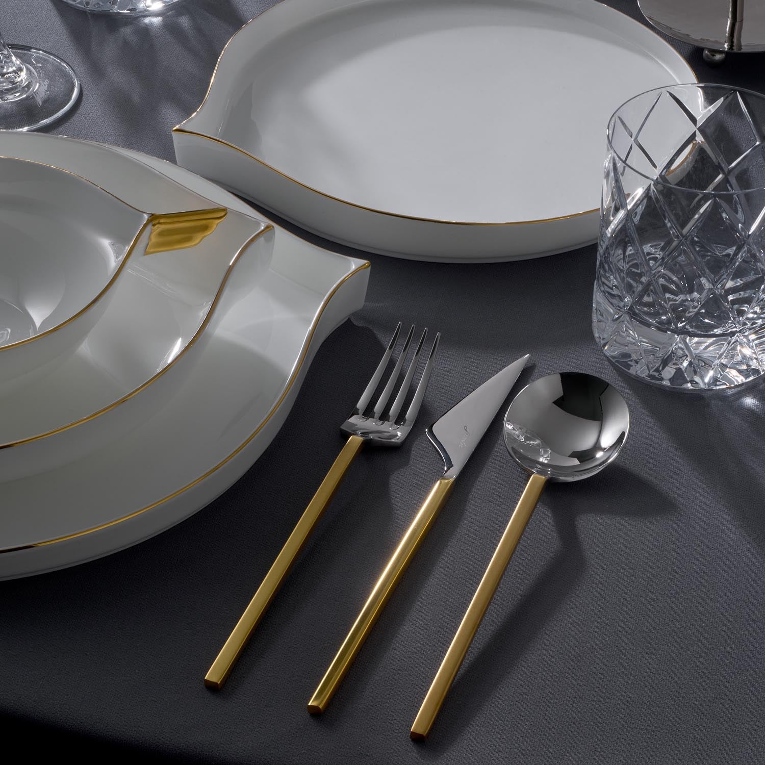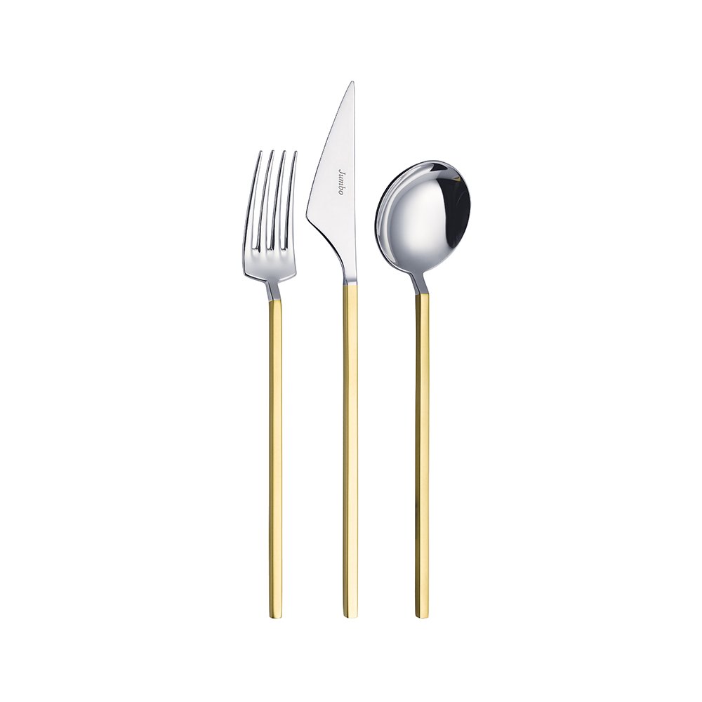 En modern sofraların baş tacı olmaya şimdiden aday bu takım, ilk bakışta göze çarpan zarafeti ile bir başka eşi benzeri olmadığını kanıtlıyor. Jumbo 9100 mat altın çatal kaşık bıçak takımı, klasikleşmiş ve geleneksel çatal kaşık bıçak takımları tasarımlarına adeta meydan okuyor. Göz alıcı mat gold ve silver tonlarında dizayn edilen bu olağandışı tasarım, sofralara yerleştirildiği andan itibaren tüm konukları kendisine hayran bırakmayı garantiliyor. Üstelik form olarak kareli hatlara sahip olduğu için en modern yemek takımlarıyla harika bir ahenk oluşturabiliyor. Daha fazla çatal kaşık bıçak takımı modelimizi yakından incelemek için Çatal Kaşık Bıçak kategorimizi ziyaret edebilirsiniz.