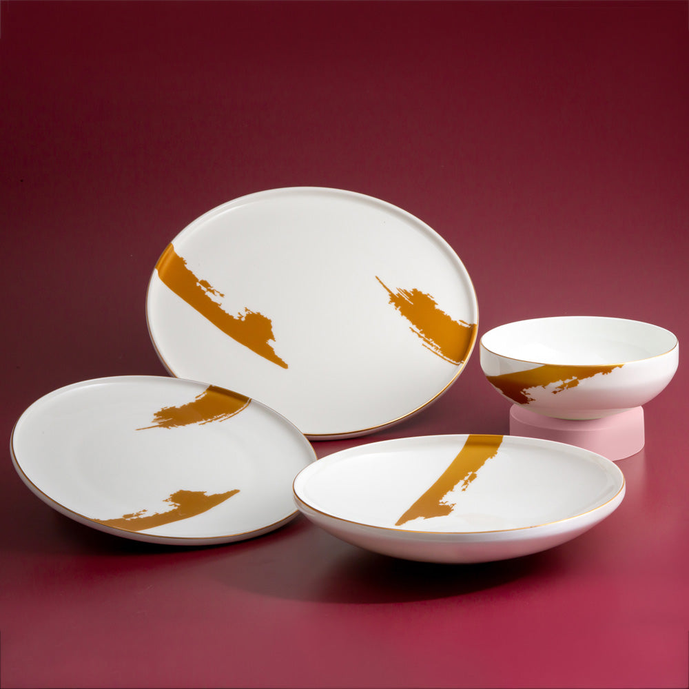Glow 24 parça yemek takımı yüzeyindeki fırça darbelerini andıran pastel tarzı stili ile büyük ilgi görüyor. Bu açıdan yemek takımlarının en sanatsal ve kreatif tasarımlarından birini beğeninize sunan model, sofralara oldukça hoş bir hava katıyor. Yüzeyinde asimetrik fırça darbelerini andıran detaylar, takımı son derece kendine has bir tasarım diline ulaştırıyor. Bu detaylar, servis tabağı, pasta tabağı ve yemek tabaklarında tabağın iç yüzeyinde yer alırken, çorba kasesinde ise dış tarafta konumlanıyor. Tüm bunların yanı sıra fine bone malzemesinden gelen beyazlık, şeffaflık ve pürüzsüzlük de hem kullanım hem de tasarım tarafına değer katıyor.