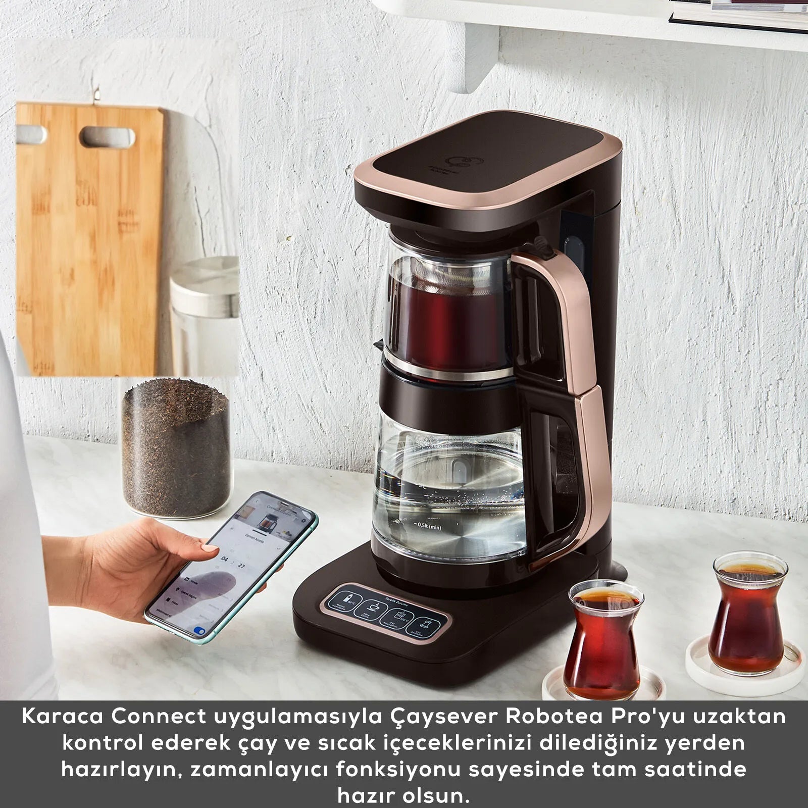 Çaysever Robotea Pro’yu Karaca Connect uygulaması ile uzaktan kontrol ederek çay, kahve ve sıcak içecek tariflerinizi istediğiniz yerden hazırlayabilirsiniz.