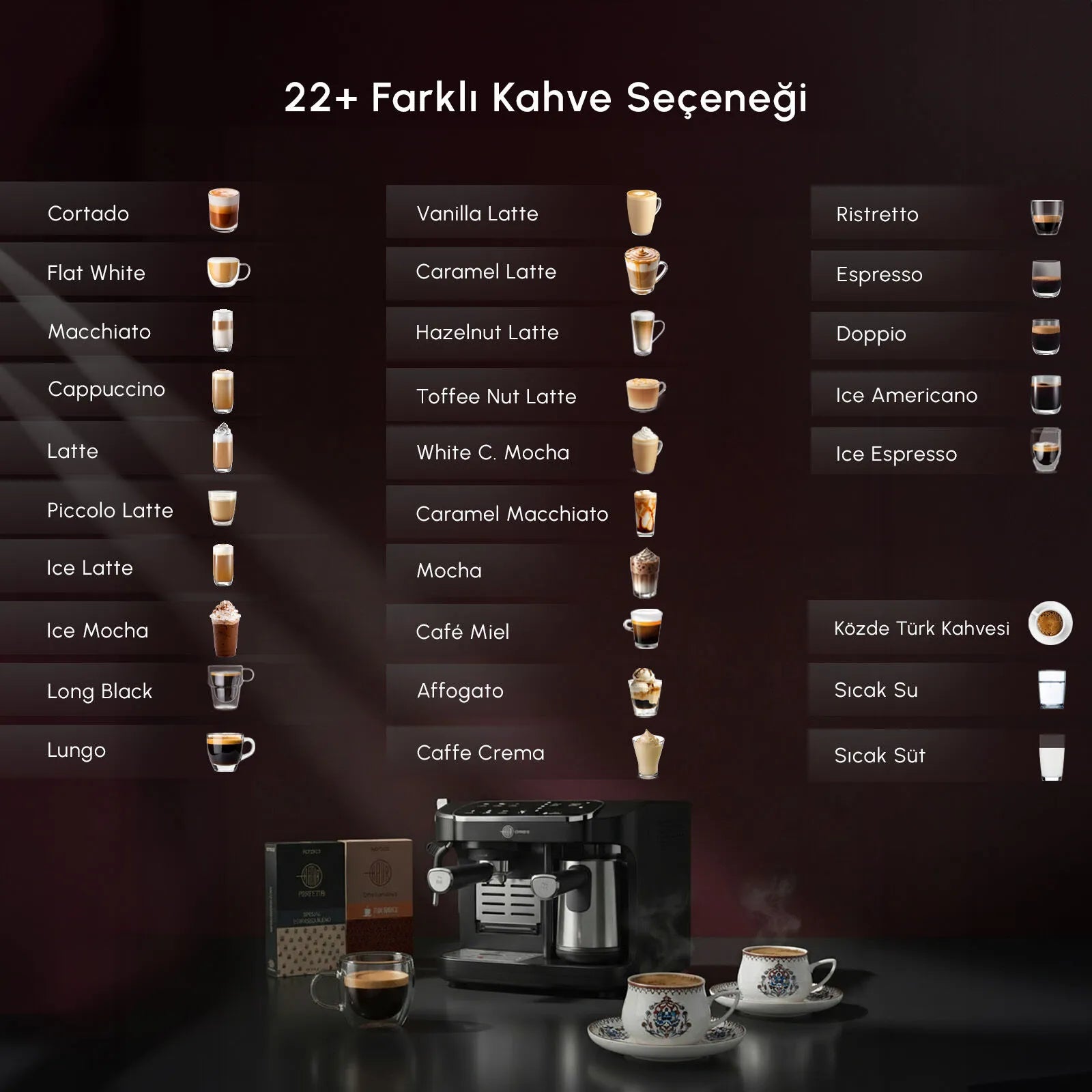 22+ farklı kahve seçeneği; Közde Türk Kahvesi (Tek Seferde 5 Fincan), Espresso, Double Espresso, Americano, Ice Espresso, Sıcak Su, Doppio, Long Black, Espresso Lungo, Macchiato, Caramel Macchiato, Cappuccino, Cortado, Flat White, Latte, Piccolo Latte, Mocha, Süt Köpüğü, Sıcak Süt, Caffe Crema, Ristretto, Ice Latte, Ice Cappuccino, Ice Mocha, Ice Americano, Affogato