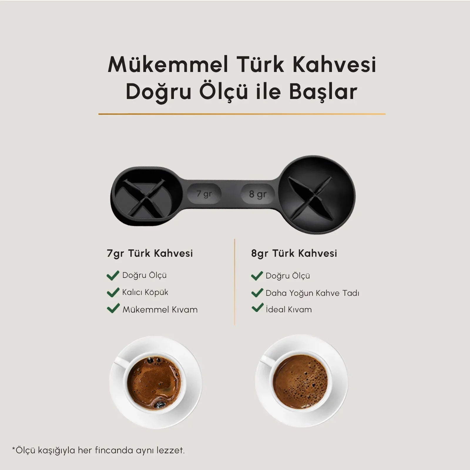 Ölçü kaşığı, kahvenin doğru miktarda ve topaklanma olmadan alınmasını sağlayacak özel bir formda tasarlandı. Temizleme fırçası ise cezve ve porta filtrede oluşan kalıntıların kolay biçimde temizlenmesi için kutu içeriğine dahil edildi.