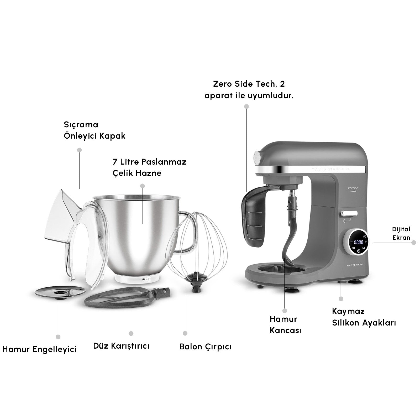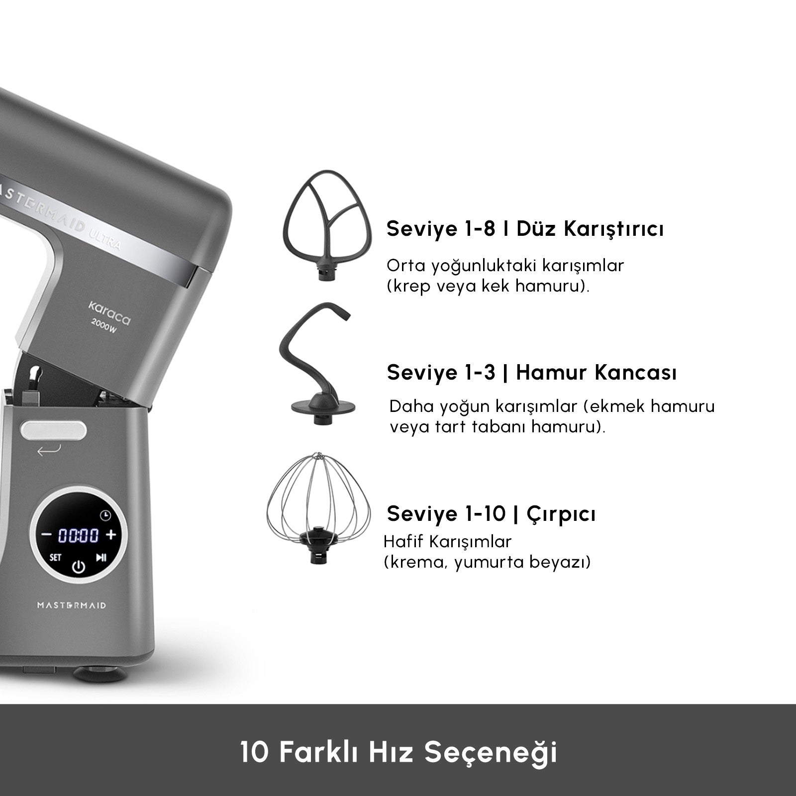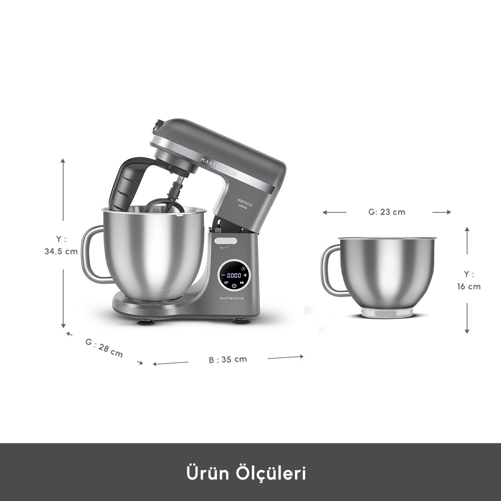 Karaca Mastermaid Chef Ultra D2000W Dijital Ekranlı Hamur Yoğurma Makinesi Galaxy Grey 7L