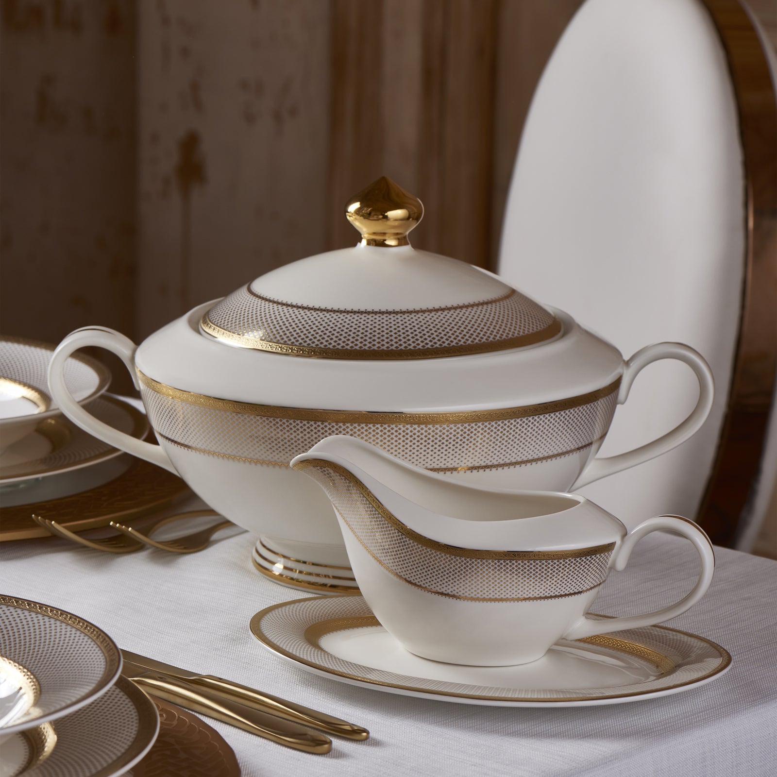 Gelenek ve tecrübeyle hayat bulan porselenler Alman kültürel mirasıyla, zarafet, asalet ve zamansız güzelliği birleştiren, her tasarımında bir hikaye anlatıyor. Barok sanatının en iyi altın vurgularını, kabartma desenlerin ihtişamlı çizgisini, saraylara özgü özel dokunuşunu yansıtıyor. Usta zanaatkarların ellerinden çıkan çarpıcı motifler, günümüzün modern ve asil beyaz porselen dokusuyla birleşerek saray ihtişamını kuşaktan kuşağa aktarıyor.